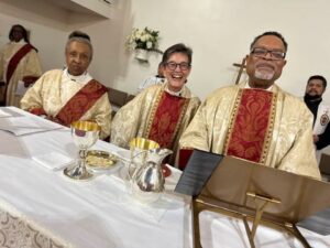 Deacon Margaret Hudley McCauley, and priests Susan Anderson- Smith and Guy Leehmuis smile from altar during for MLK Eucharist.