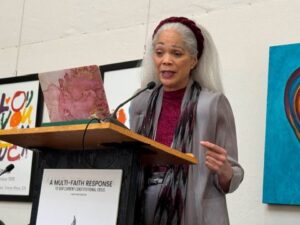 “We sometimes debate about whether events such as this and the organizations that host them are interfaith or multifaith,” Taylor said. “My friends, we are all-faith. Missing from public life today is a distinct, unified expression of our core principles. So I propose that we need an All-Faith Democratic Union. Its vision statement would be to hold power accountable to the golden rule to the extent that it rules out acts of unnecessary violence and cruelty for cruelty’s sake. Its mission would be to identify politicians who are in violation, organize against them, crush them peacefully at the polls, and send them home to see if they can learn some manners.”