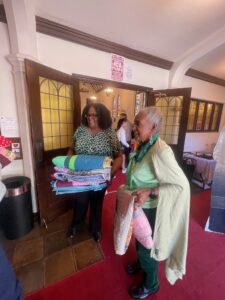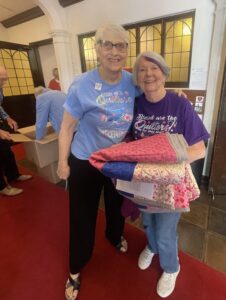 “Today we are surrounded by the prayerful creativity of our piecemaking quilters who have stitched prayer into every one of these quilts. You can probably feel that prayer from your bottom up, if you’re sitting on one, or your back. Prayer for the recipients who will also be covered with this quilt. Prayer for the recipients and their situation in life, prayer for their home and their families, prayer for their communities and countries, prayer for those who will transport them and who will deliver them.