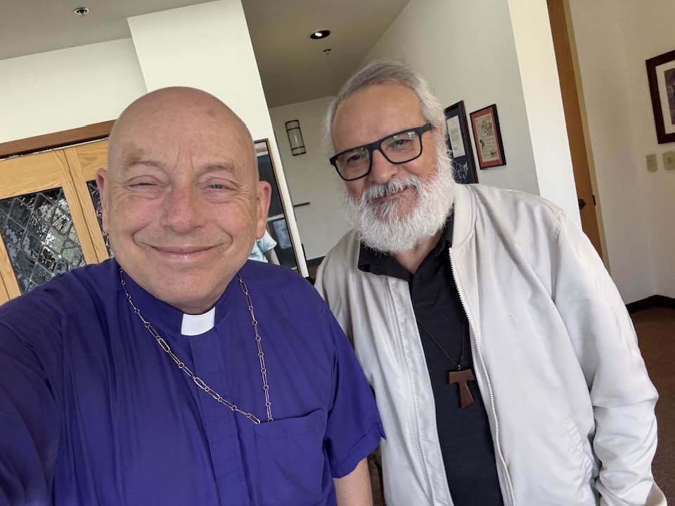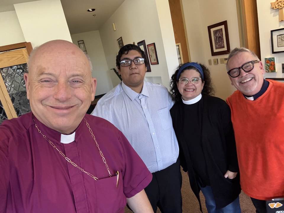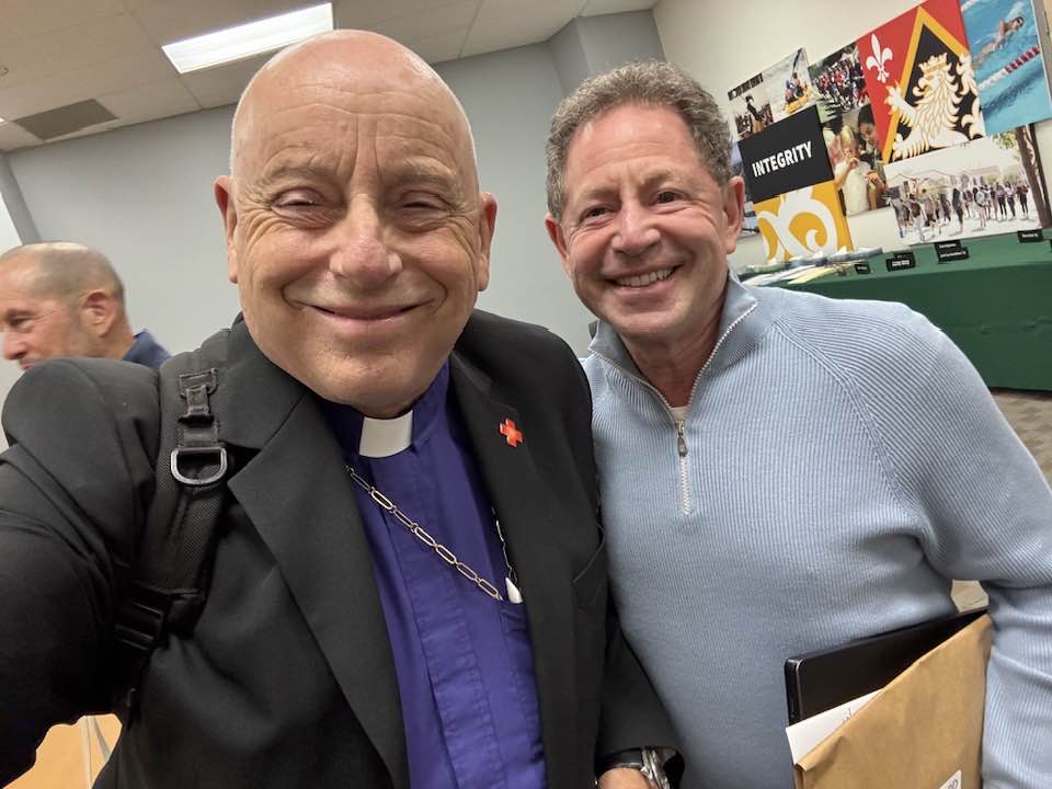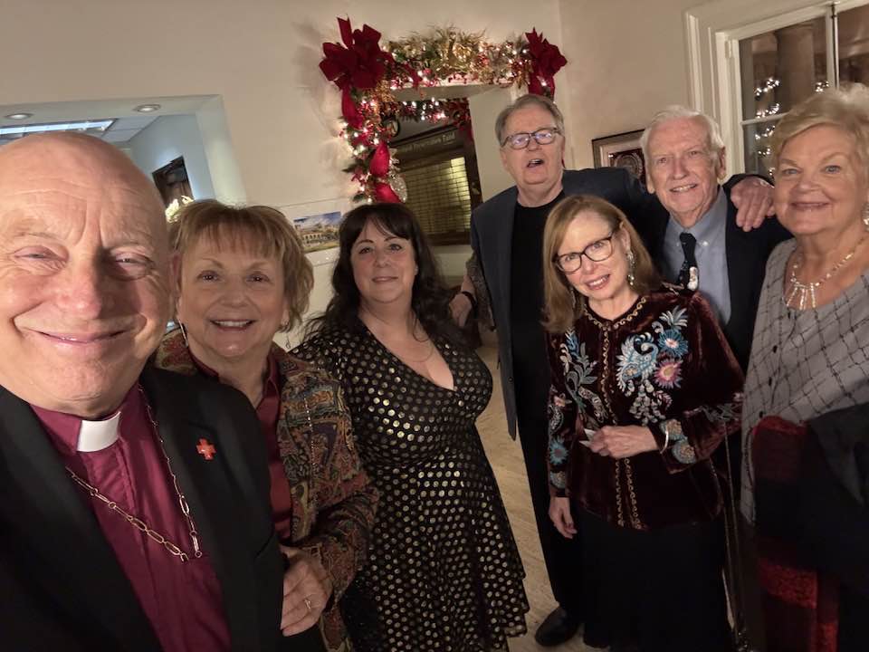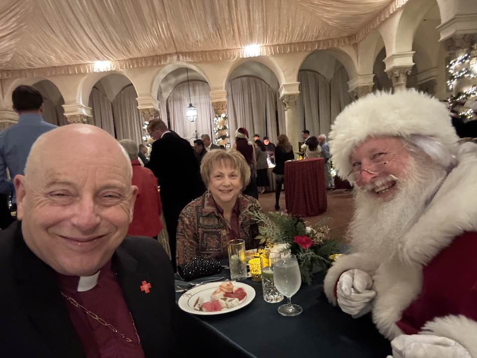 You meet the most amazing people in the days before Christmas around the Episcopal Diocese of Los Angeles, including Seeds of Hope executive director Steven Trapasso, who dropped by with Alana, their son, Sebastian James, and Steve’s Garden State mom, Gloria… Jose Santos, who helps run St. Clement’s Episcopal Church in Huntington Park, with my St. Paul’s Commons, Echo Park colleagues the Rev. Norma Yanira Guerra and Rev. Canon Thomas Quijada-Discavage… Canon Andy Tomat, leaning graciously into his recent retirement as the hardest working volunteer diocesan treasurer in show business, for conversation over lunch at the The Huntington Library, Art Museum, and Botanical Gardens about space, politics, and faith… friends from the December Harvard-Westlake School board meeting, including advancement specialist Casey Kim with a beautiful tote bag she designed as a thank you to board members, and my fellow trustee, actor (“Moneyball”), business leader, and philanthropist Bobby Kotick… Mostyn Trundinger-Smith, completing a wonderful tour as managing editor of “The Episcopal News”; he’ll continue as a consultant… my esteemed colleague the Rt. Rev. Naudal Alves Gomes, former primate of Brazil, who pastors two of our congregations while counseling the deacons and priests of our Spanish-speaking missions and parishes… and friends from All Saints Episcopal Church in Pasadena at a delightful Christmas party, where Santa joined Kathy and me at our table.