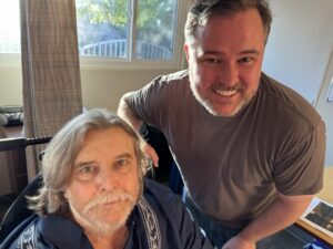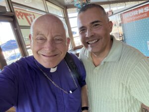 My rounds early in the week included chats with our bishop-elect, the Rev. Dr. Antonio Gallardo, at our hang at Norm’s in Pico Rivera, and the Rev. Bryan Jones, an innovative priest and former St. Luke’s of the Mountains Episcopal Church/ San Lucas de las Montañas vicar who has been courageously enduring a series of health setbacks. That’s he with his son, Sean.