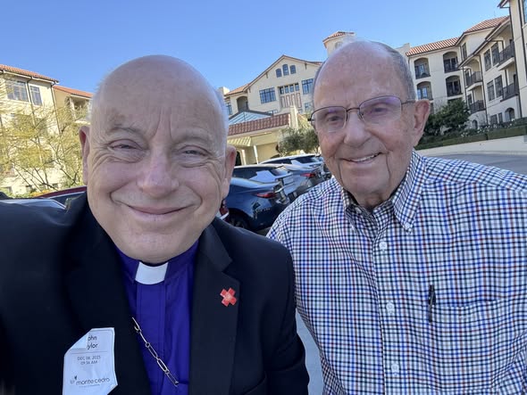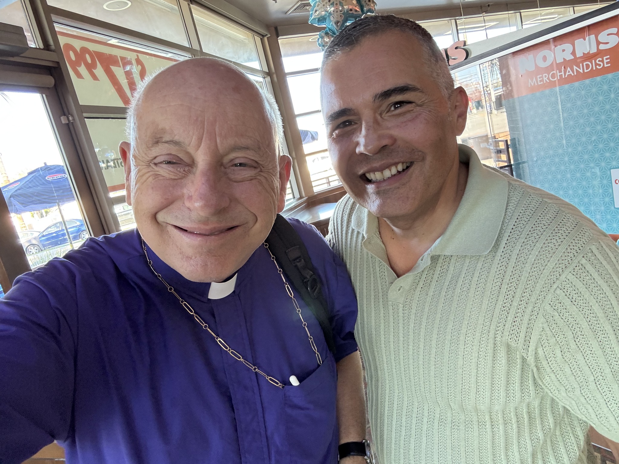 My rounds early in the week included chats with our bishop-elect, the Rev. Dr. Antonio Gallardo, at our hang at Norm’s in Pico Rivera, and the Rev. Bryan Jones, an innovative priest and former St. Luke’s of the Mountains Episcopal Church/ San Lucas de las Montañas vicar who has been courageously enduring a series of health setbacks. That’s he with his son, Sean.