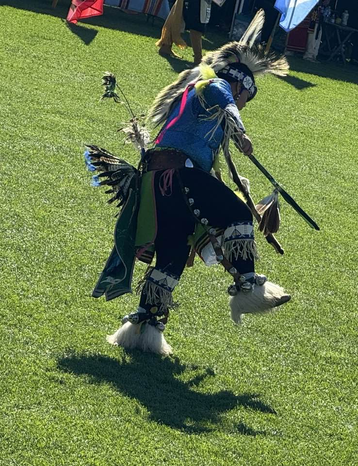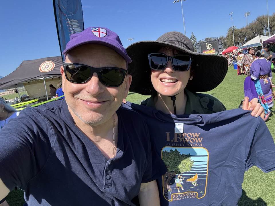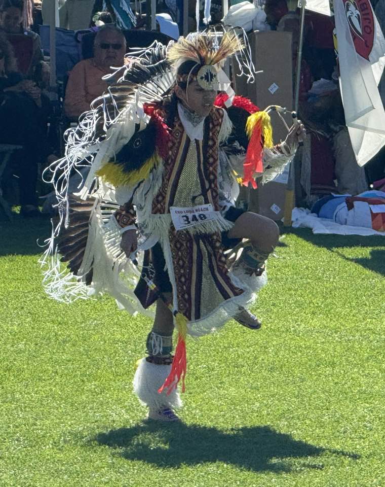 It was daughter and CSULB alumna Lindsay’s fifth powwow and my first. It continues tomorrow. Today we saw several intertribal dances as well as individual competitions for younger dancers. Adults complete tonight. We enjoyed eating fry bread, tacos, and kettle corn and wandered among the crafts booths. The powwow identifies its location as Puvungna, a sacred site and ancient Tongva village preserved on campus between two dormitories.