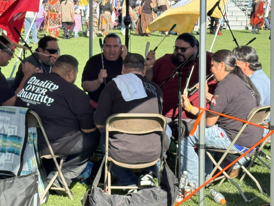 Arlie Neskah, a member of the Diné-Navajo nation, is a musician, composer, and artist who is serving as MC at this weekend’s 53rd annual powwow at California State University, Long Beach. He kept it light during this afternoon’s performances, even throwing in a glancing, dancing reference to the old Creedence Clearwater Revival song “Green River.”