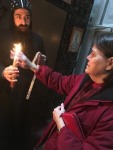 [Members of the Episcopal Diocese of Los Angeles received this letter today in English and Spanish. If you would to be on the email list, let me know in Messenger. The photo shows pilgrim Jane Peterson of Fullerton’s St. Andrew’s Episcopal Church in the Church of the Holy Sepulcher in Jerusalem in 2017.]
