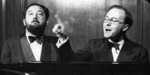 “Respectable songs for responsible people” were the stock in trade of Flanders and Swann, practitioners of English light music most famous for their live albums “At the Drop of a Hat” (1957) and “At the Drop of Another Hat” (1964), the latter produced by George Martin, also the Beatles’ producer. Michael Flanders (at left in the photo) wrote the words, pianist Donald Swann the music.