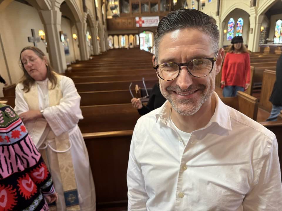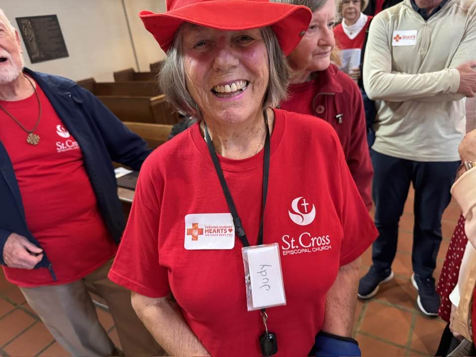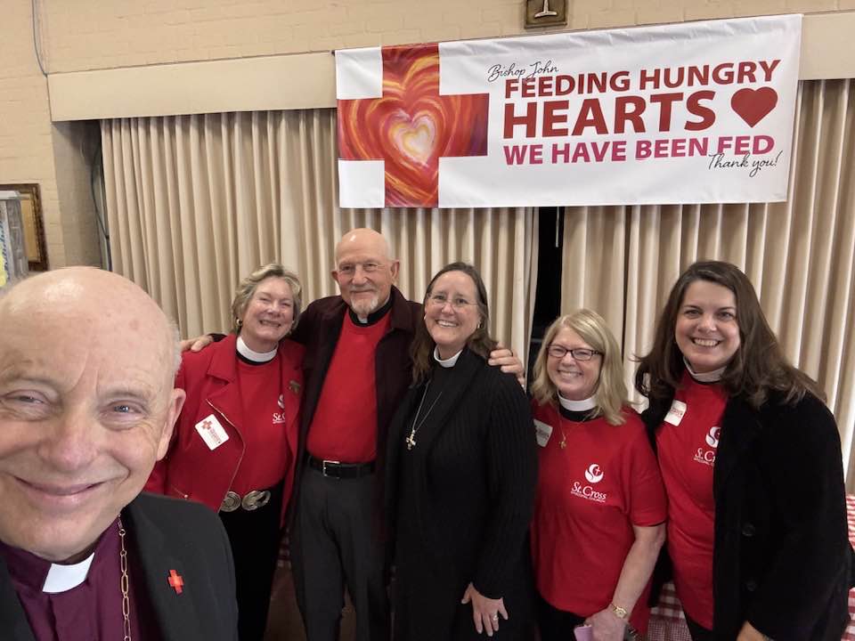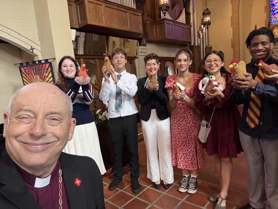 I felt touched just that way when I saw that St. Cross had hung a banner showing the slogan I’ve used during my episcopacy, “feeding hungry hearts.” “We have been fed,” it kindly said. Rachel had congregants pose with it and me at both 8 and 10 a.m. At coffee hour, amid conversations with thoughtful St. Cross folks about church and politics, I was invited to join in the parish’s TikTok video ministry. Watch for it on an iPad near you. I even got to bless a flock of knitted chickens, souvenirs from a recent parish pilgrimage to an alpaca ranch. We prayed they would all stay away from El Pollo Loco.
