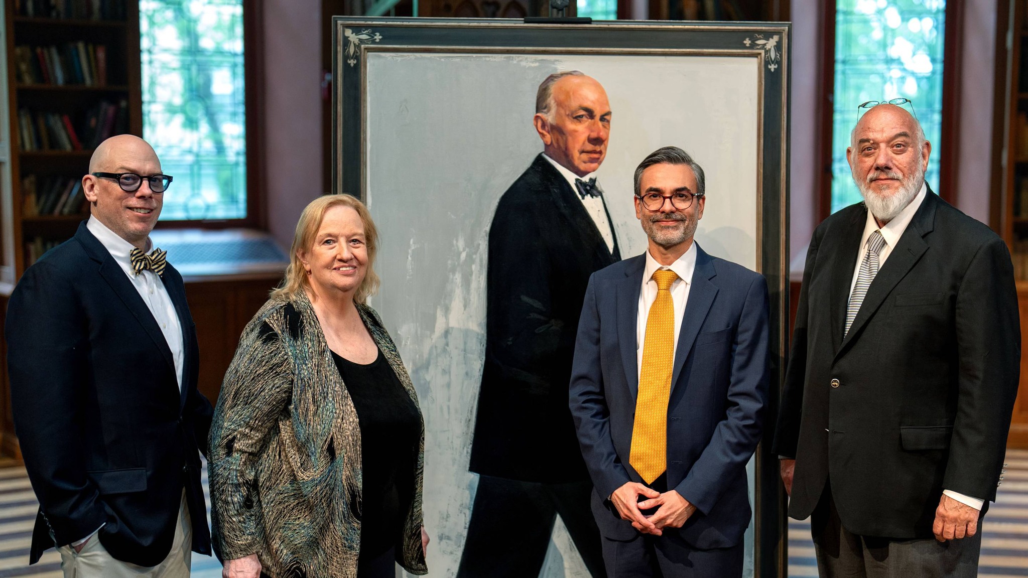 Original art, selected by Gabri and his lay leaders, fills the hallways and the walls of the nave. So too at Princeton University, also thanks to Gabri. His father was Puerto Rican-born actor and director Jose Ferrer, class of 1933. When Princeton asked Gabri to help find Jose’s portraitist, he thought it appropriate that the artist also be Puerto Rican, hence his choice of Luis Alvarez Roure. In the photo block, you’ll see the artist (yellow tie) and his painting; also posing are Gabri (far right) and his siblings Rafael and Leticia.